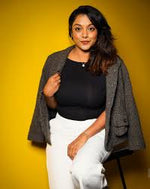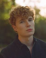 Woman with eyes closed standing outdoors with trees and sunlight in the background
